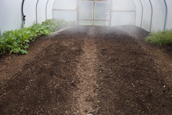After clearing tomatoes, aubergines, basil, marigolds, and other summer plantings, the ground is dry. Especially after tomatoes, which I had not watered for one month. The spray line is a good way to re-wet soil, which takes a while to soak up new water and become fully moist, before planting.